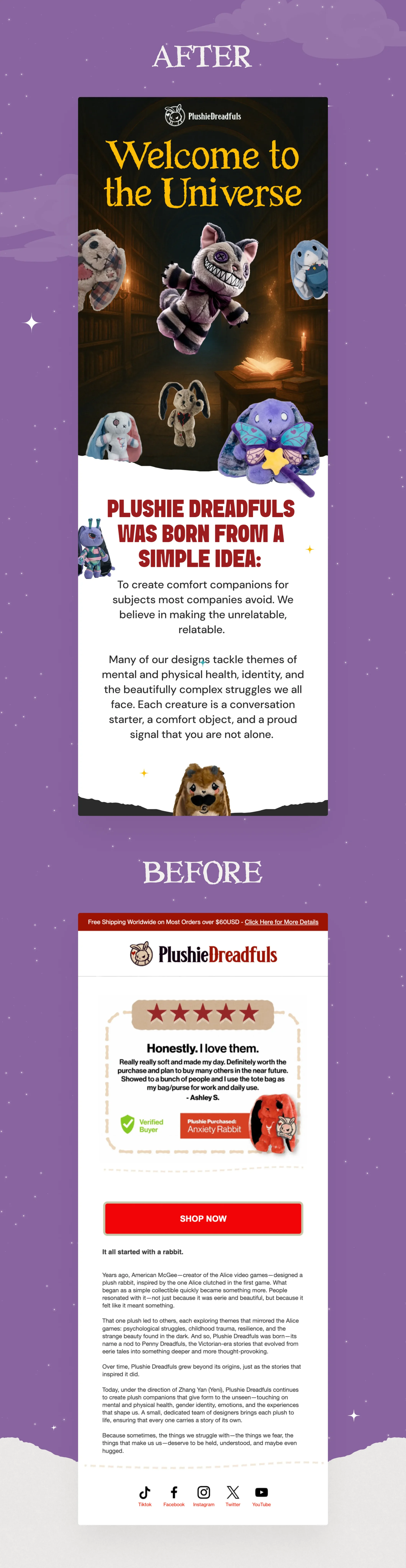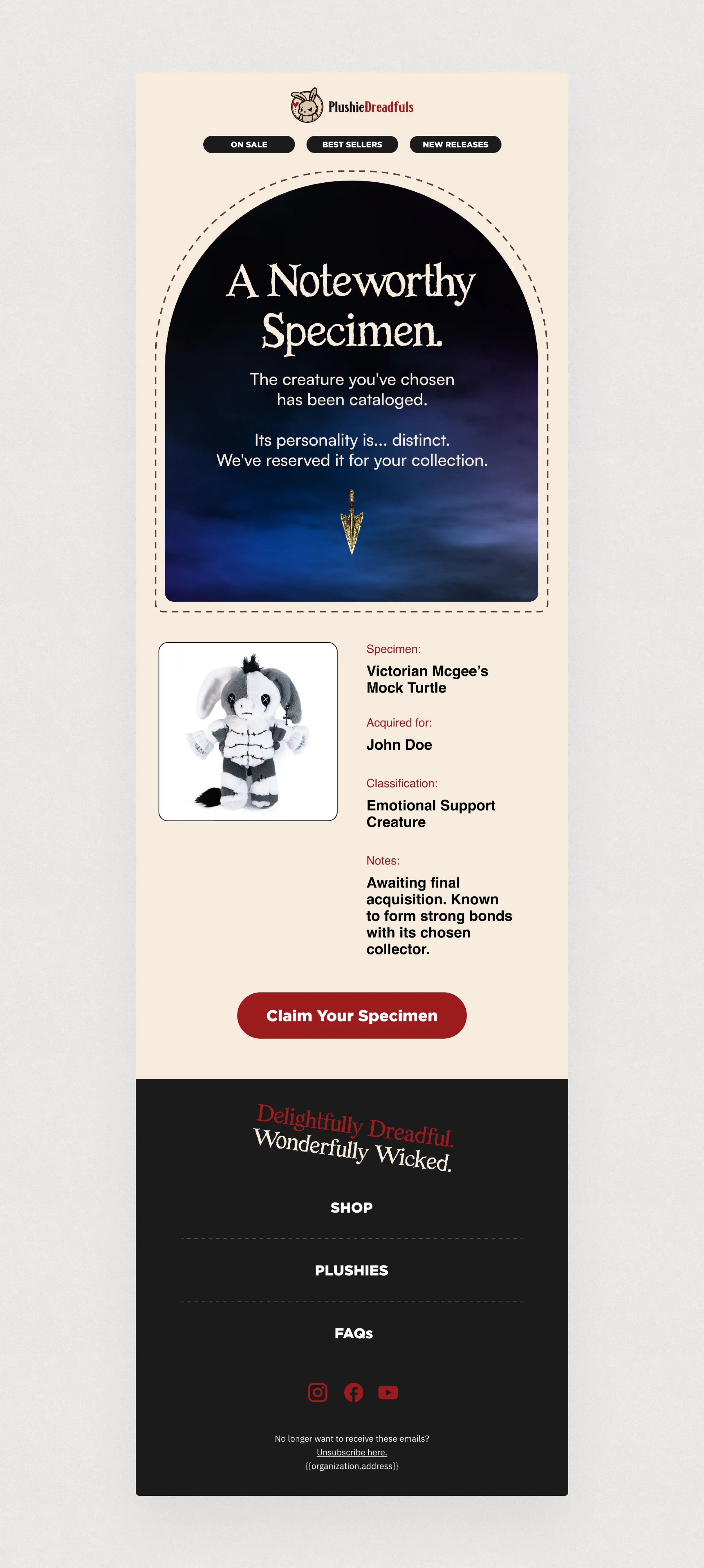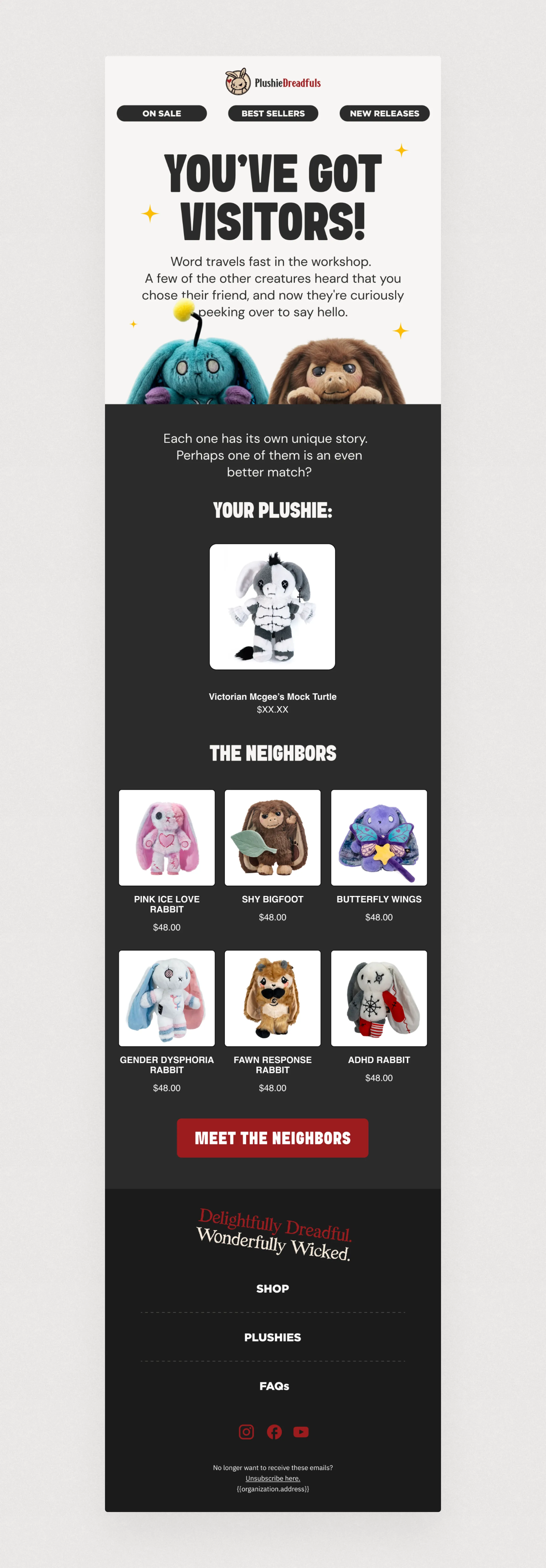 Welcome Series: Brand-aligned onboarding that introduced customers to the Plushie Dreadfuls universe.