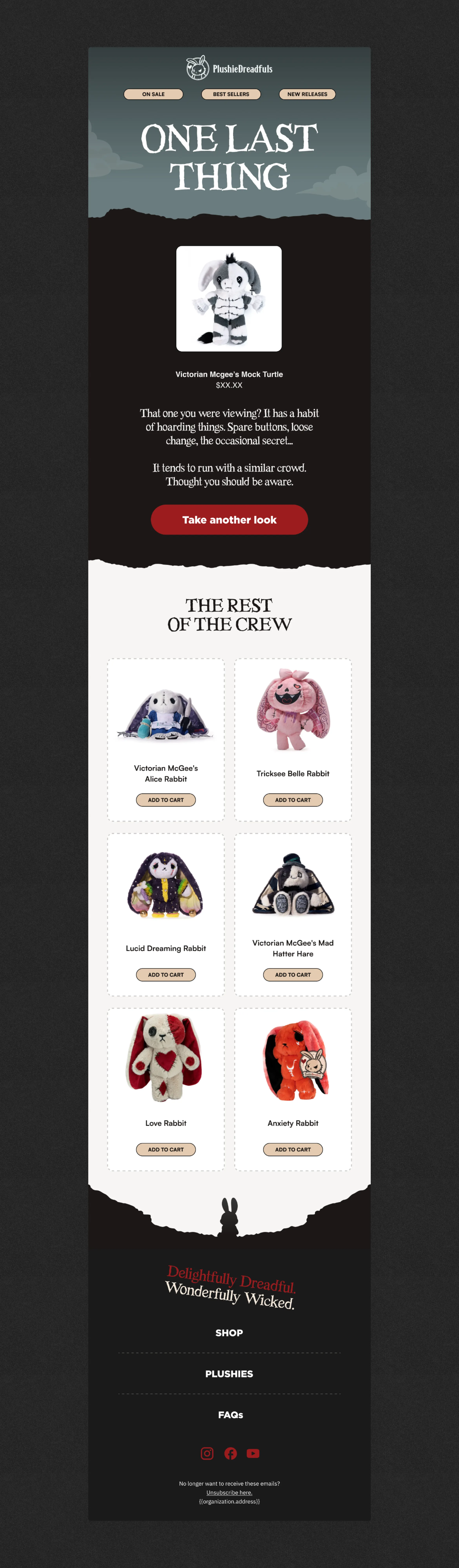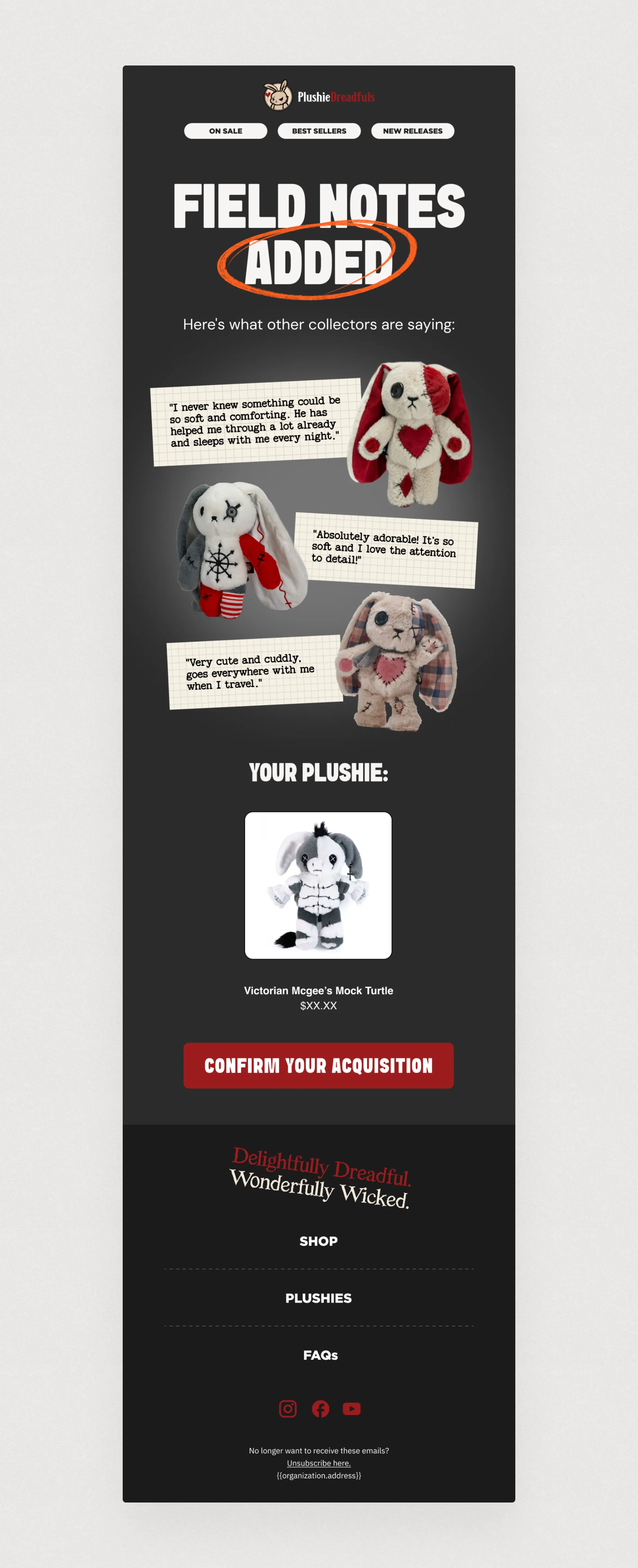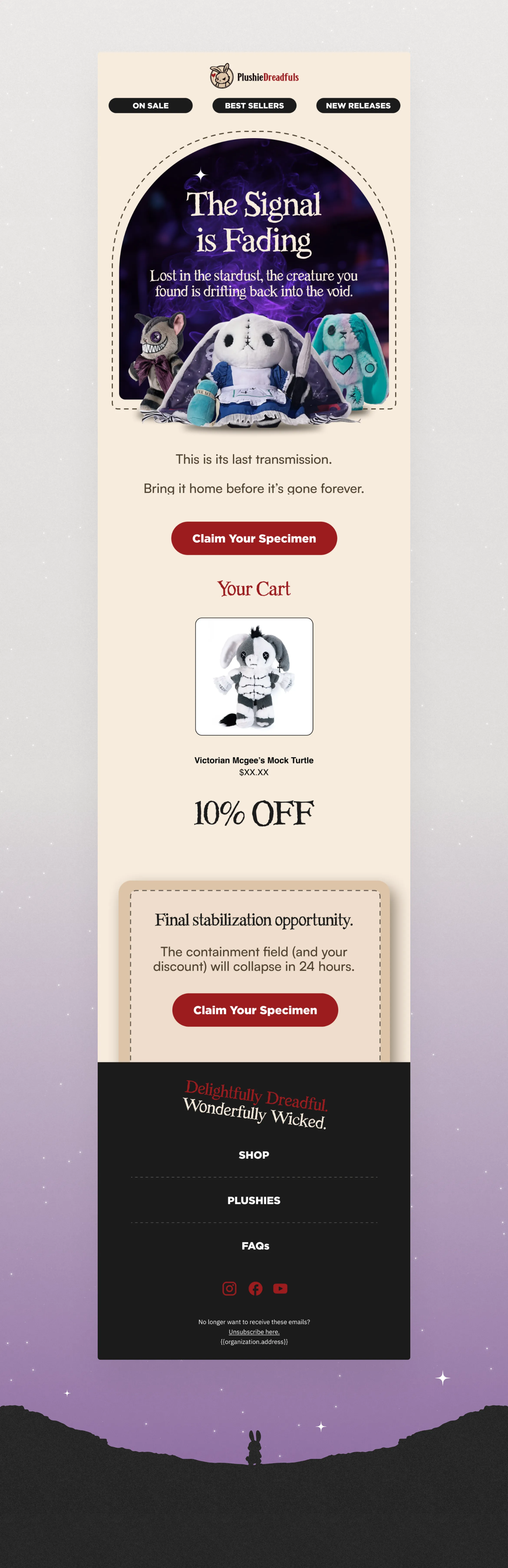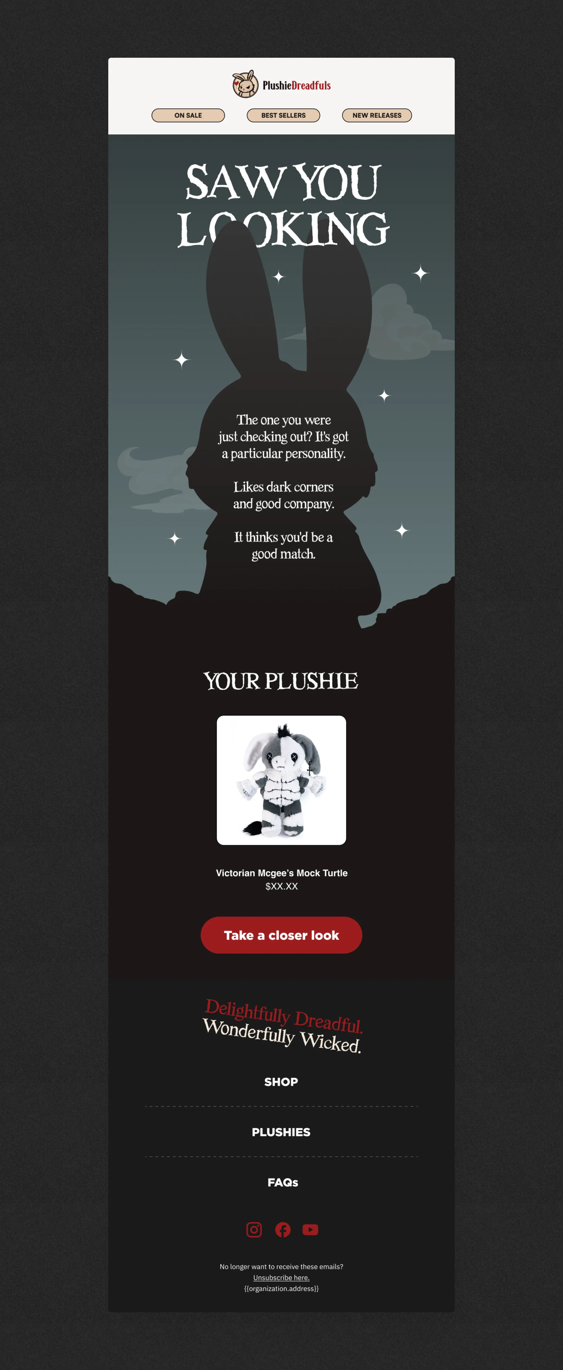 Welcome Series: Brand-aligned onboarding that introduced customers to the Plushie Dreadfuls universe.