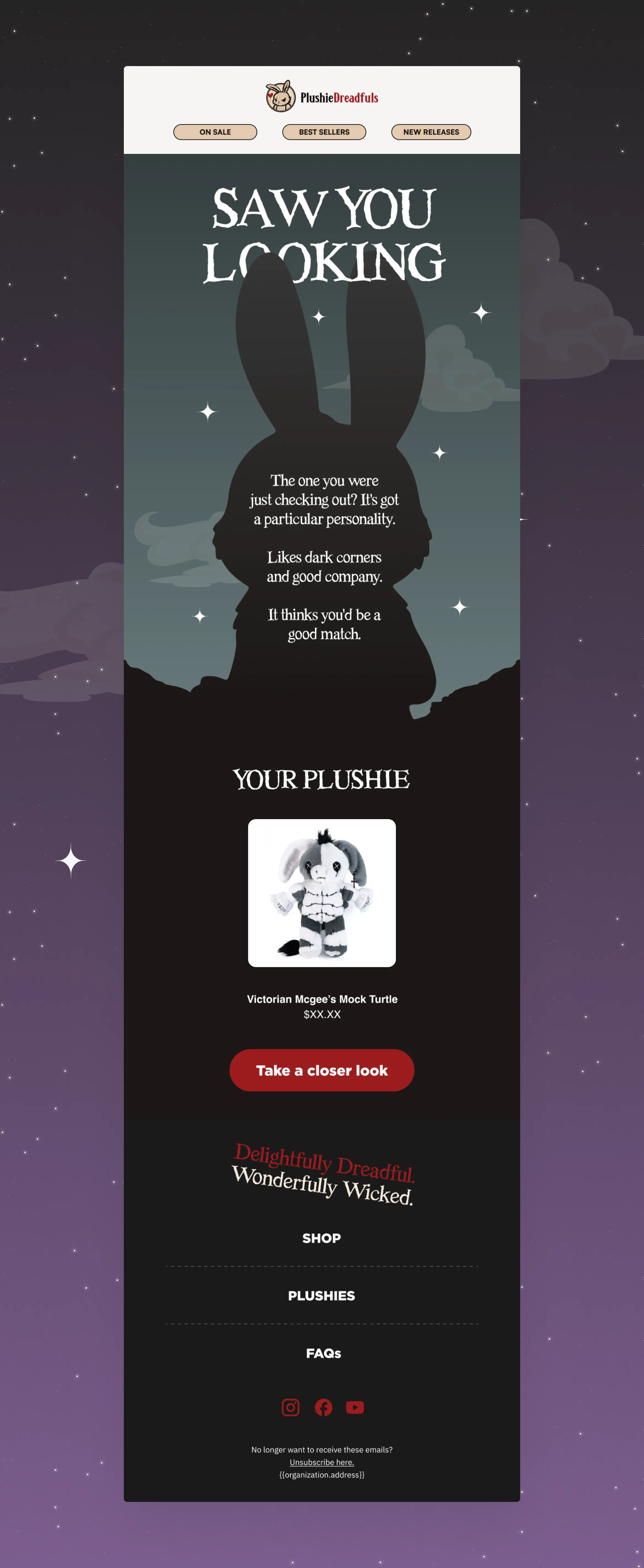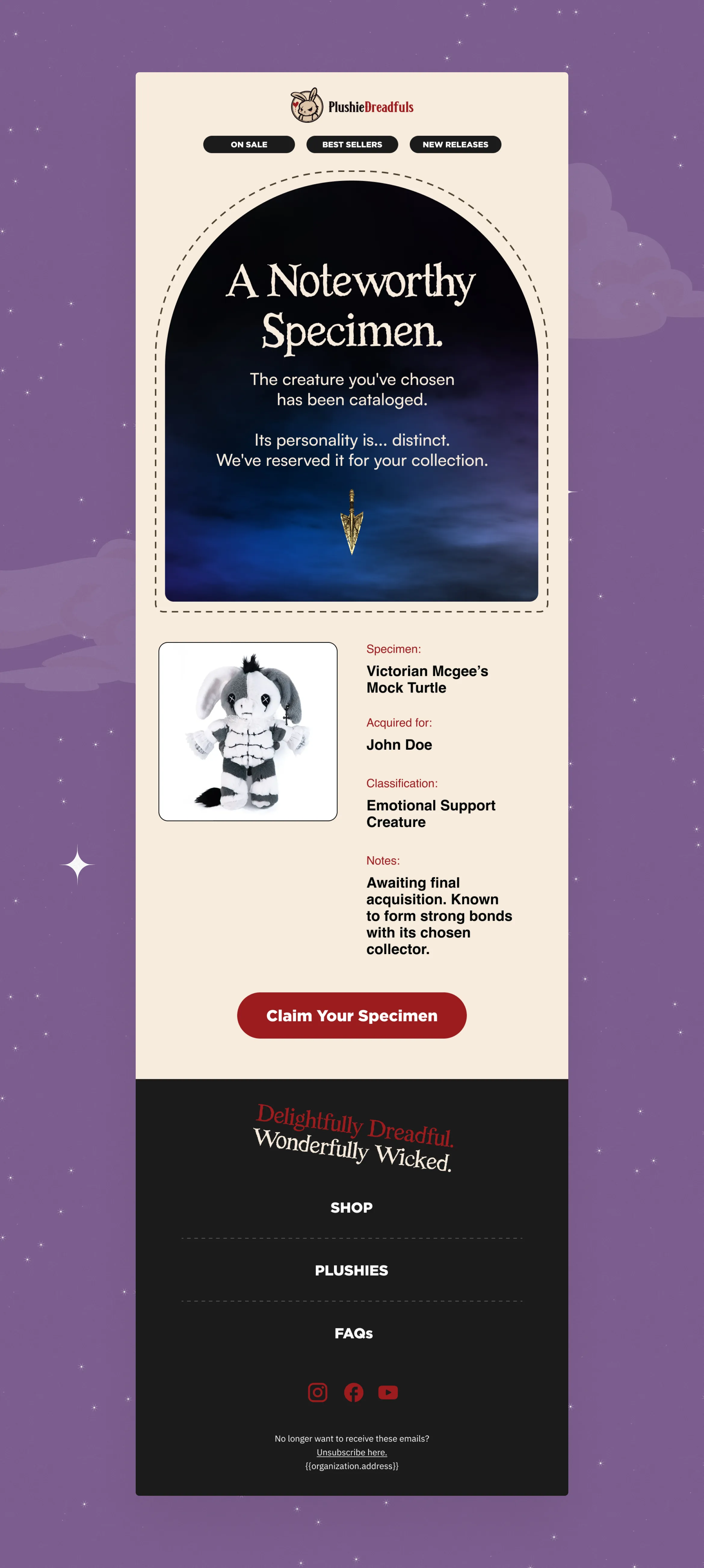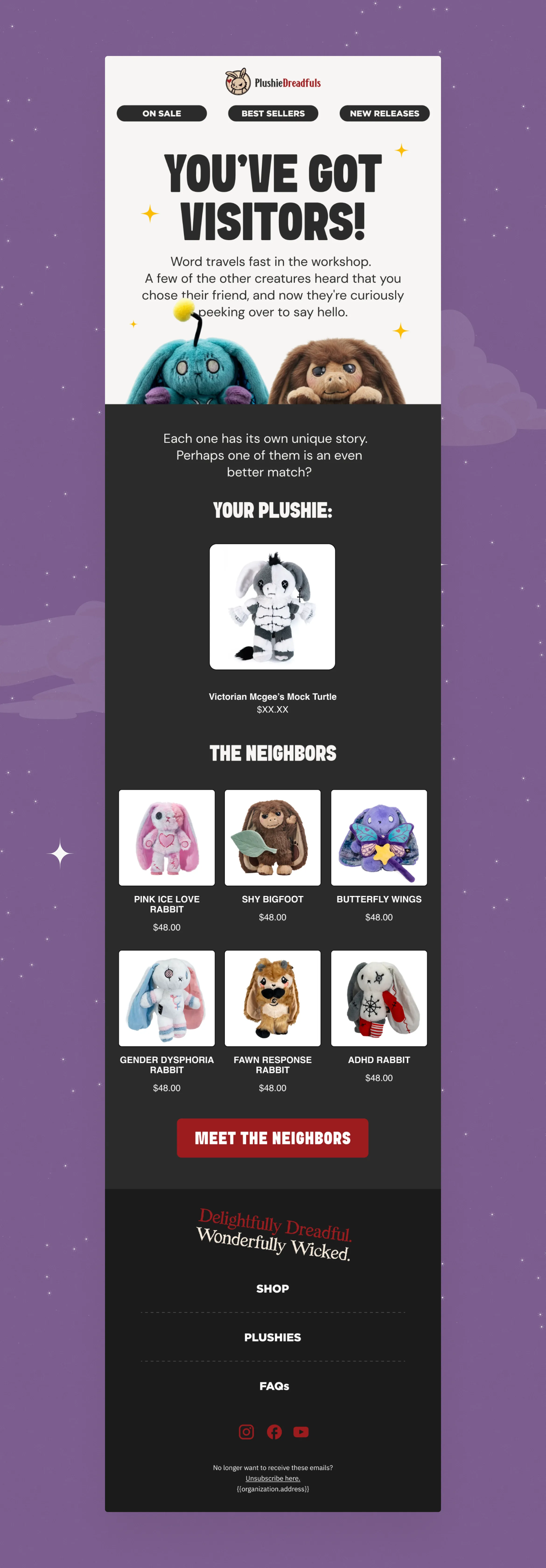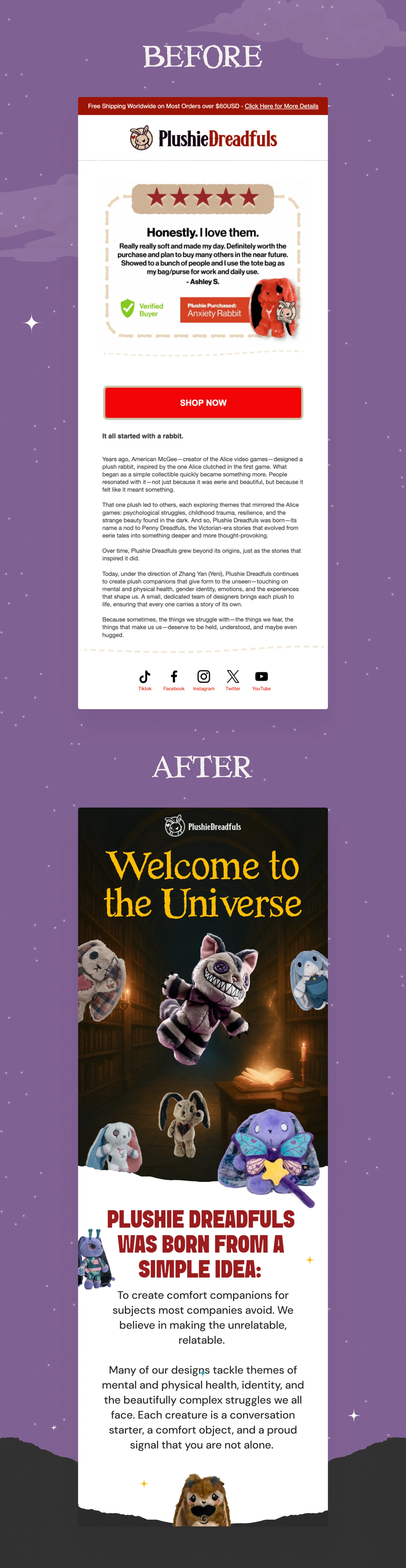 Welcome Series: Brand-aligned onboarding that introduced customers to the Plushie Dreadfuls universe.